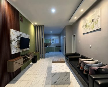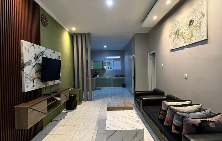 Interior: Ruangan ini memiliki konsep modern dengan satu sisi dinding berwarna hijau zaitun dan sisi lainnya berwarna abu-abu, dilengkapi dengan dekorasi lukisan dinding dan jam kayu. Lantai menggunakan keramik bermotif marmer yang senada di seluruh ruangan.