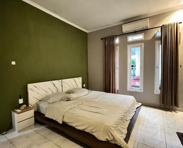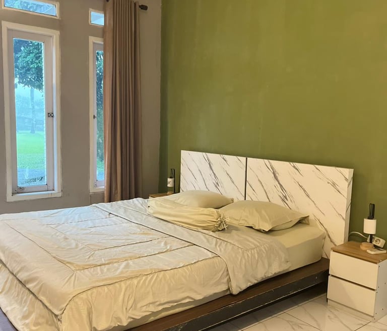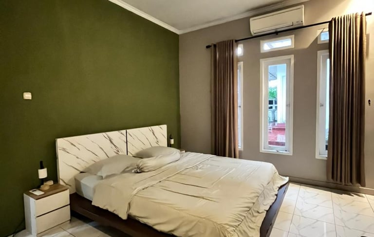 Interior Kamar: Dinding menggunakan kombinasi warna hijau zaitun dan abu-abu, senada dengan ruang tamu. Terdapat jendela tinggi yang memberikan pencahayaan alami serta pemandangan ke arah taman.