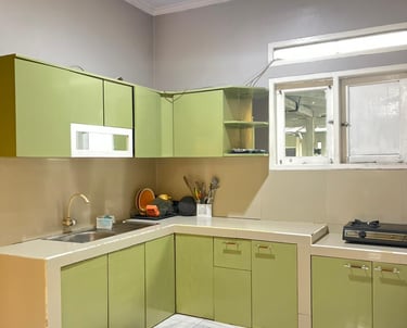 Area Dapur: Terletak di area terbuka yang menyatu dengan ruang keluarga, dapur ini memiliki kabinet atas dan bawah berwarna hijau cerah.