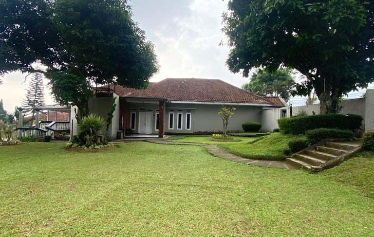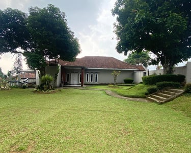 Taman & Halaman: Villa ini memiliki halaman rumput hijau yang luas dengan tanaman hias yang tertata rapi di bagian tengah dan pinggir bangunan.