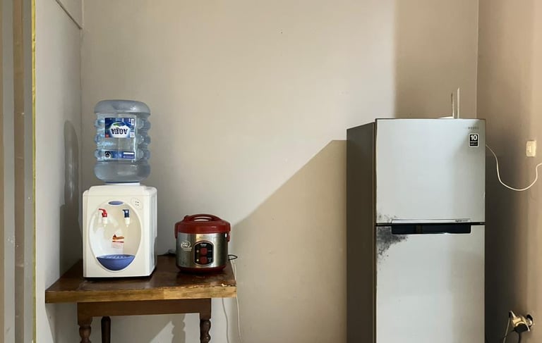 Fasilitas Elektronik: Terdapat kulkas dua pintu (Samsung), dispenser air minum beserta galonnya, serta rice cooker yang diletakkan di meja tambahan.