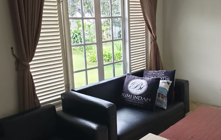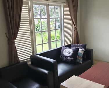 Furnitur: Sofa panjang berwarna hitam berbahan kulit/sintetis dengan bantal merah yang kontras. Lantai ruangan menggunakan keramik putih bersih yang memberikan kesan luas.