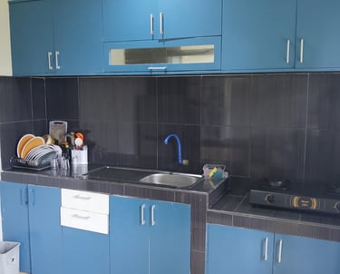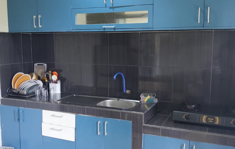 Alat Memasak: Tersedia kompor gas dua tungku dengan teko (ketel) ungu, wastafel cuci piring, serta rak piring kecil di atasnya.