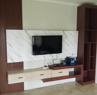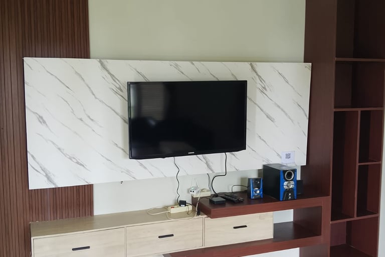Fasilitas Hiburan: Tersedia TV LED yang terpasang di dinding dengan meja TV minimalis di bawahnya untuk menaruh alat pemutar media atau remote.