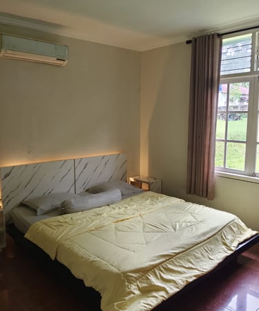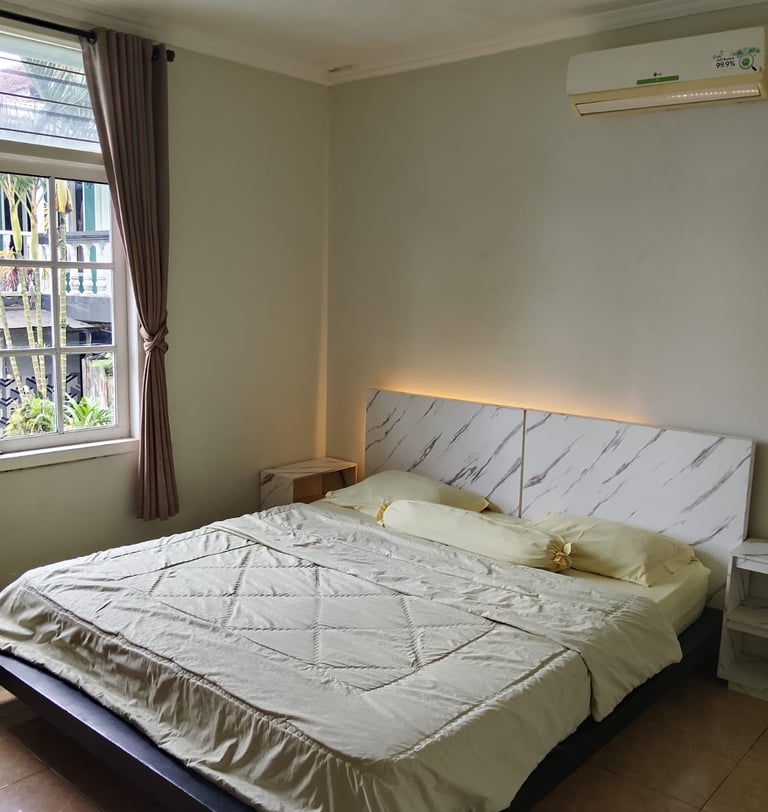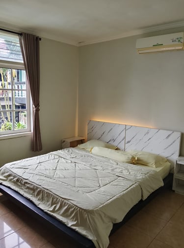 Fasilitas Eksterior: Villa ini memiliki area teras yang bersih dengan lantai keramik putih. Terdapat pintu utama berwarna putih minimalis dan tiga jendela kaca vertikal yang memberikan banyak cahaya alami.