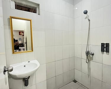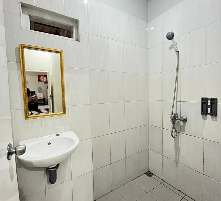 Kebersihan: Seluruh dinding dilapisi keramik putih untuk memastikan suasana tetap higienis dan terang. Terdapat ventilasi udara di bagian atas agar kamar mandi tidak lembap.