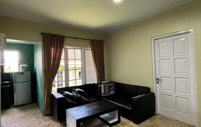 Fasilitas Hiburan: Tersedia TV LED dengan rak minimalis dan sofa kulit hitam empuk yang dilengkapi bantal merah untuk tempat berkumpul keluarga yang nyaman.