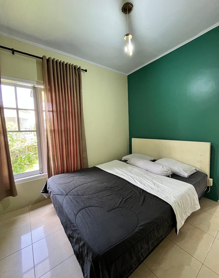 Fasilitas Tambahan: Jendela besar dengan gorden tebal untuk privasi, serta area lorong yang dilengkapi lemari pakaian kayu terbuka dan hanger
