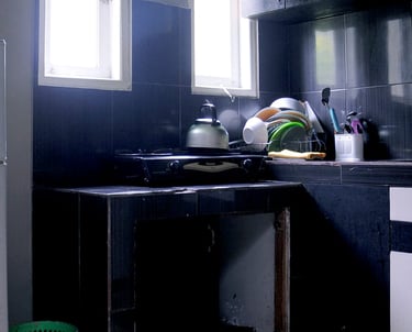 Alat Masak: Kompor gas 2 tungku, wastafel cuci piring, dan rak piring.