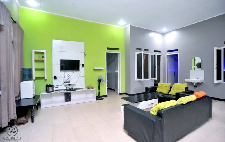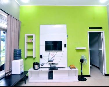 Hiburan Keluarga: Dilengkapi dengan TV LED yang terpasang di dinding dan rak minimalis.