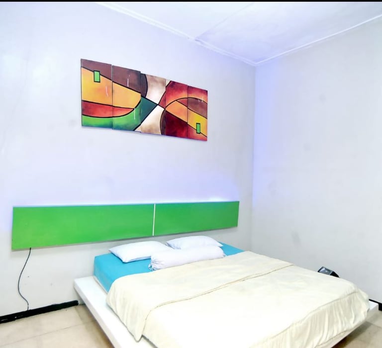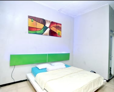 Istirahat Berkualitas: Kasur ukuran besar (King/Queen size) yang nyaman dengan sprei bersih dan dipan putih minimalis.
