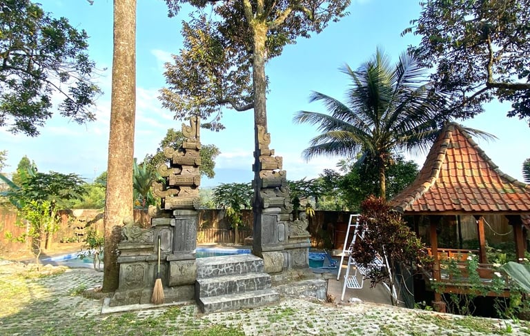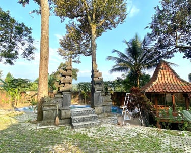 Spot foto dengan sentuhan budaya Bali yang unik dan instagramable, menampilkan ornamen tradisional dan suasana yang eksotis.